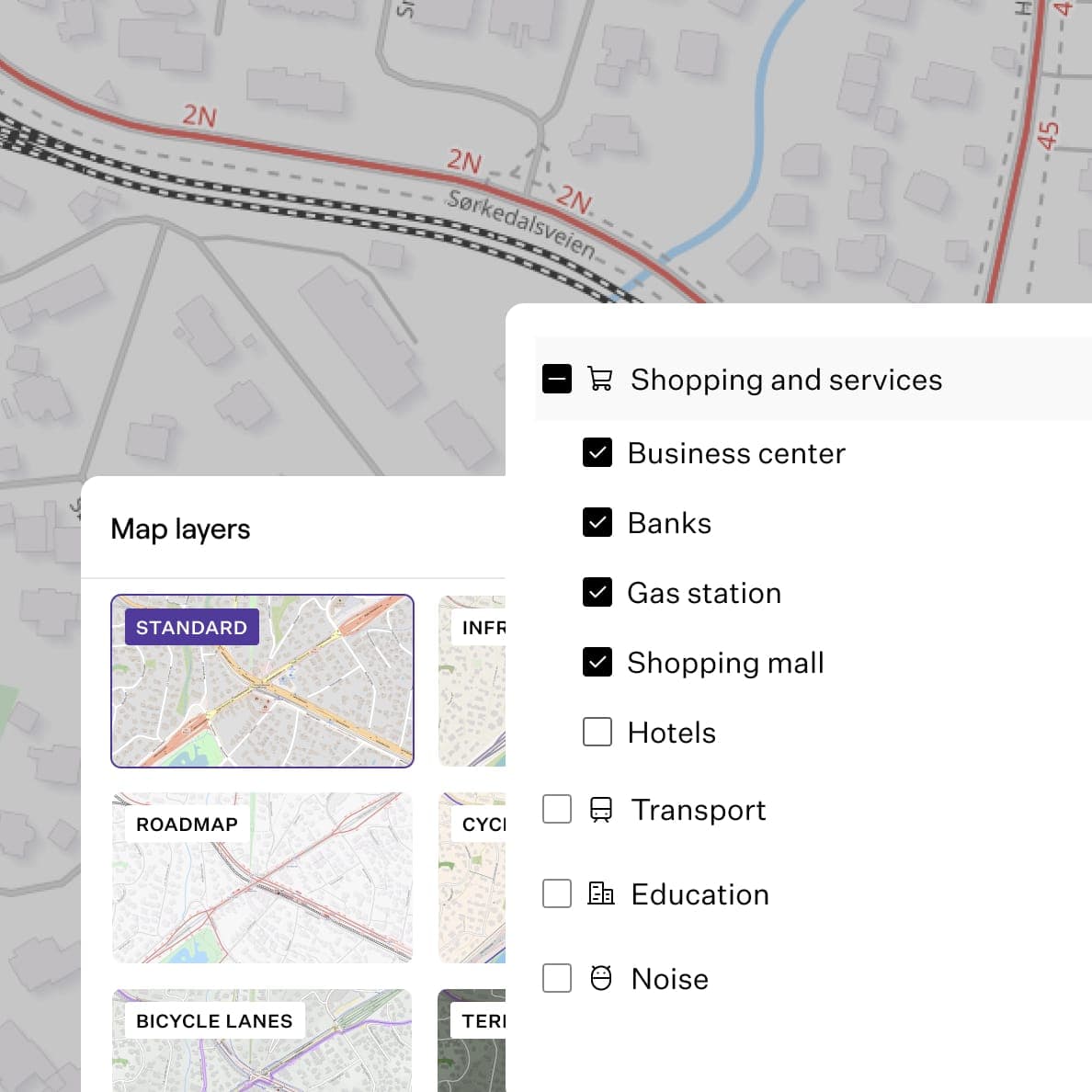 - Multiple data layers; Point of interest, noise, transportation, education and more